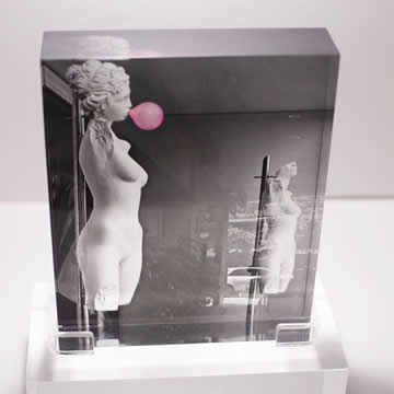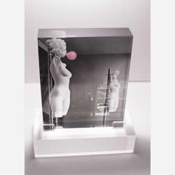 Escultura fotográfica. Bloque de acrílico de 4 cm de espesor x 21 cm altura x 16 ancho, sobre base de acrílico de 5 x 21 cm. 2025. $ 650 dólares