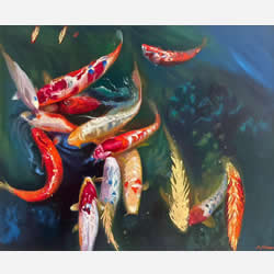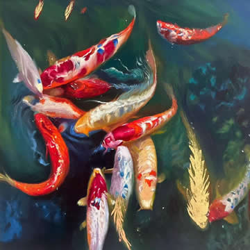 Fuente de Koi Óleo y hojas de oro sobre lienzo. Técnica mixta. 58 x 67 cm. 2024. $ 400 dólares