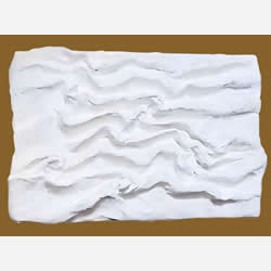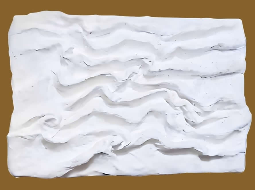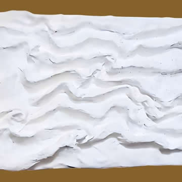 Vibraciones en Blanco Técnica mixta. Pasta lisa y rústica, cerámica, yeso, malla metálica y acrílico. 60 x 40 cm. 2025. $ 250 dólares